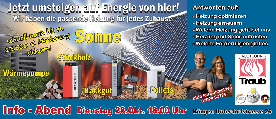Terminflyer PDF – Bitte immer anmelden 07024 82726 Welche Heizung ist die Richtige für mich und unser Haus? Welche Auflagen habe ich? Welche Förderungen gibt es und wie bekomme ich Sie? Auf was lasse ich mich ein wenn ich eine „politisch gewollte“ Heizung einbaue, die nicht zu meinem Haus passt? – Wir haben Antworten –…
